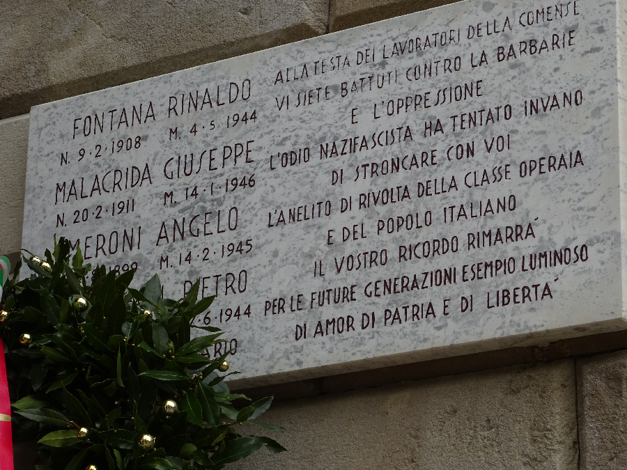 Plaque commemorating 4 out of the 6 workers deported to German labour camps following the strike in Tintoria Comense. 3 died in Mauthausen, 1 died shortly after returning to Como due to bad health induced by the prison regime. The other 2 (both women) survived.