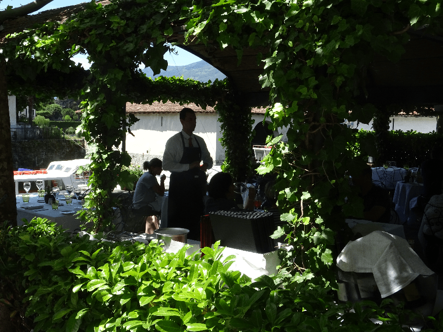The terrace of the Darsene di Loppia restaurant looking over the small port in Loppia