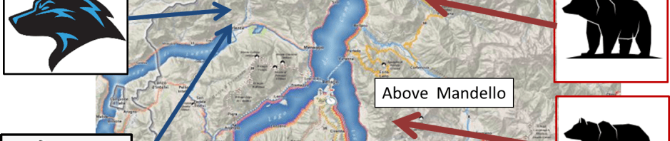Wolves and bears have been making a return to the Alps since the turn of the century after an absence of 100 years. Our area of the Alps is perhaps one of the last to see their return. Wolves were always present in the Apennines but they have recently been spreading up through Liguria and into Piedmont before moving east. Bears instead first re-established themselves in Trentino and the Alto Adige before spreading west. This can explain why recent sightings of wolves have been on the west side of the lake while bear sightings have been, up to now, restricted to the Lecco leg of the lake above its eastern shores.