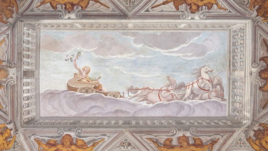 Aurora driving her horse-drawn chariot from east to west, from dawn to dusk.