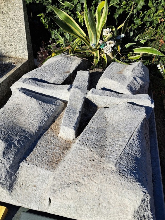 Another of Como’s much appreciated sculptors was Eli Riva who based himself for most of his professional life in Rovenna, the village above Cernobbio. He had little interest in the commercial art world preferring to focus on his own development of the artisan skills of so-called ‘direct carving’. This was a technique favoured by a number of modernist sculptors such as Henry Moore or Barbara Hepworth in which the stone would be shaped without reference to previous clay or plaster models so as to allow the nature of the material to determine aspects of the final design. A good example of this technique can be seen at the grave of the Baragiola family in Campo D. The sculpture is formed out of the same block of granite that covers the family tomb. Riva has chiselled out of this block the form of a cross lying horizontally which is said to symbolise the body of Christ. Riva’s work developed from the figurative towards the abstract. The Baragiola tomb dates back to the late nineteen sixties.