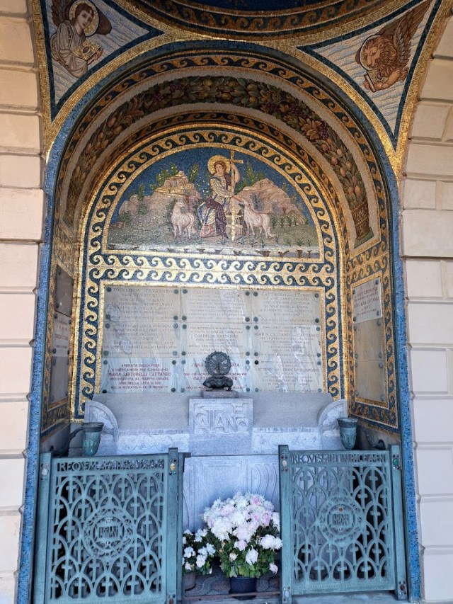 Detail of the mosaic in the lunette of the Cattaneo memorial.