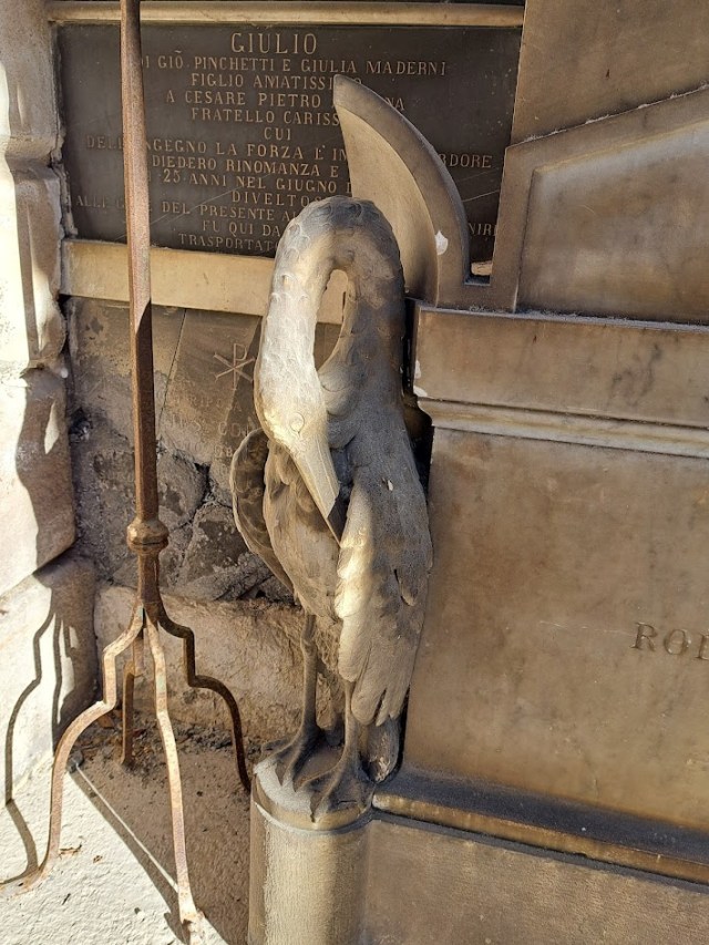 It is by Giovanni Tavani, a local artist, and represents Paolo and Fraancesca, real life protagonists in a tragedy depicted by Dante in the Divine Comedy. Giovanni Tavani was born in 1934 as the son of the sculptor Pietro Tavani. (There is also a work by his father in the cemetery). He trained as an architect but on graduating devoted himself entirely to sculpture until his premature death at the age of 48 in 1982. He specialised in sacred art and developed a unique style based on medieval representations subjected to geometric revision. He has two works present in the cemetery. Back in the city, he designed the memorial to Giuseppe Sinigaglia, the Olympic rower, behind Villa Geno.