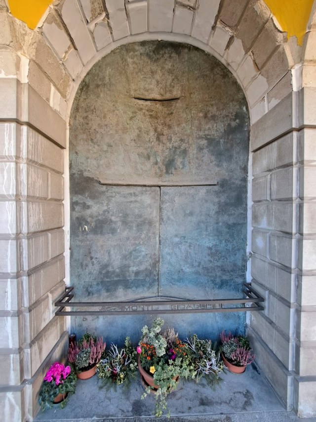 Riva also designed one of the more recent monuments in the cemetery dating from 1978. It is the monument to the Azzimonti-Gioacchini family in Chapel number 60. It is a purely abstract work that symbolises the door or gate into heaven. The only way through the splits in the bronze surface is to become a spirit and thus go through into the afterlife. It seems born out of meditation and designed to provoke meditative moments for those looking on it. The actual dedication to the family is kept separate from the main work itself so as not to detract from its impact.