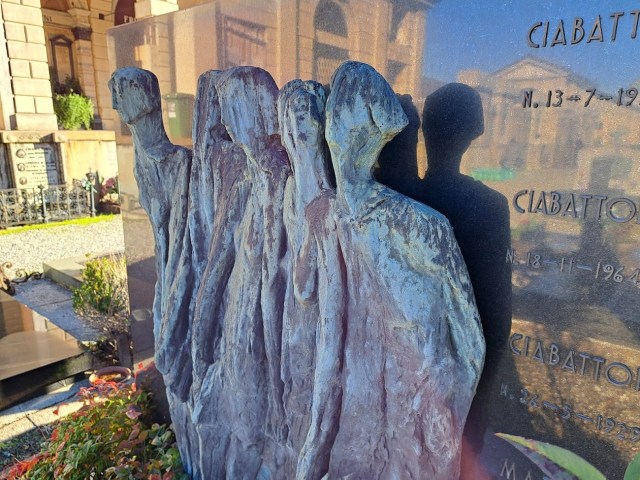In Campo C there is another work by Riva dating back to the same period. This is the monument dedicated to the Ciabattoni family. The five spectral figures are depictions of those from Dante’s Purgatory. Their ghostly quality is accentuated by the contrast in their crumbling appearance against the dark shining polished marble behind them. He apparently got inspiration for these ghostly images from some of the oxidised Gothic statues taken down from Como Cathedral before restoration.