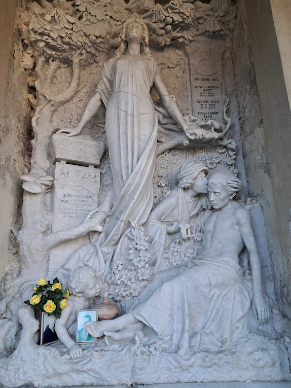 The delicacy of Rusconi’s work can also be seen in the monument to the Bazzi family in Chapel Number 65/66. He places the lifeless body in the bottom right of the scene with his head cradled by a woman. A small child comes out of the flowers at the body’s feet. The woman and the child are identified as the wife and child of Uberto Bazzi. The central female figure looking and rising upwards is a symbol of the soul rising to heaven.