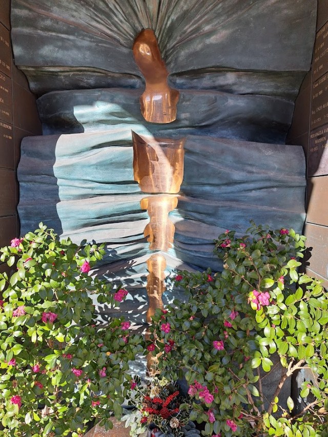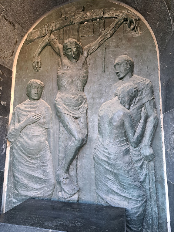 Here again Somaini works with the contrast between polished and oxidised bronze in this dramatic presentation of a crucifixion. There are still figurative traces in this work in the delineation of the body but the abstract aspects provide the symbolic power of the polished image to stand out from the folds of the background. Here again, a scripted dedication would detract from the sculpture but the side walls give space to put individual plaques to commemorate the family members.