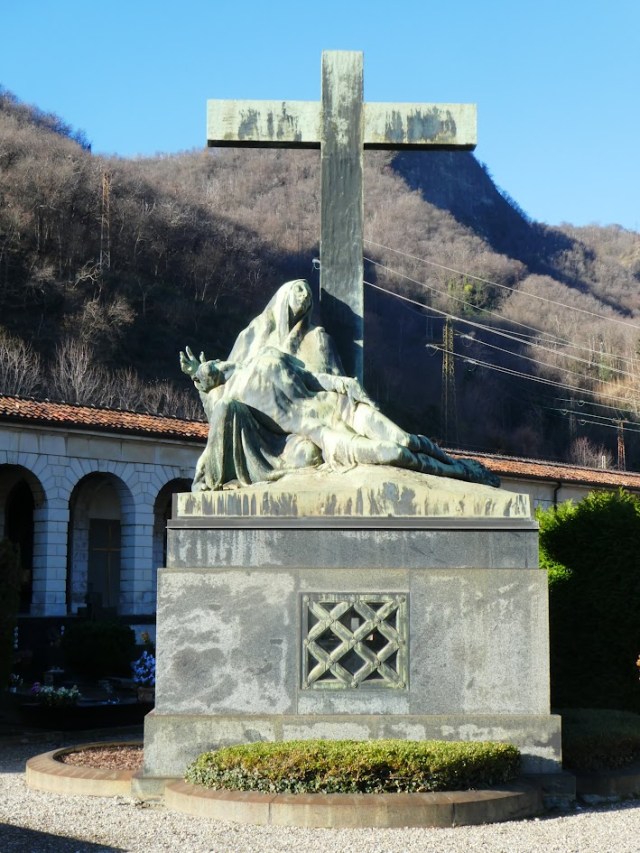The quality of some of the sculpture and artwork is one good reason for visiting the cemetery. Another might be to see the memorials to some of Como’s more famous names. For instance, the memorial that stands out on immediately entering the cemetery is that to Francesco Somaini who died in 1939. The chapel itself was designed by Federico Frigerio, arguably the 20th century architect who has most influenced the way the centre of Como looks today. However the impact here is the large scale ‘Pieta’ in bronze sitting above the chapel and sculpted by Giannino Castiglioni. Francesco Somaini was an industrialist who established his cotton mill in Lomazzzo in 1893 adopting a revolutionary factory design first developed in Manchester. His factory lies alongside the Lomazzo railway station and now houses the series of high-tech startups known as ComoNext. Francesco Somaini was a great sponsor of Federico Frigerio and paid for the construction of Frigerio’s Tempio Voltiano on the lakefront. His own grandson, also named Federico, was a local sculptor of some renown and has examples of his work elsewhere in the cemetery.
