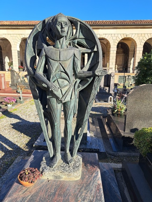 Giuliano Collina was born in 1938 in Intra but moved to Como with his family in 1944 where he lived up until his very recent death on 14th November 2025. He trained and graduated from the Brera Academy. He did not specialise in sacred art but was always interested in the concept of the fallen angel and of angels in general who feature in both of his monuments within the cemetery. He dedicated most of his life to painting whilst also teaching design and art history in Como schools. In his later years he turned to sculpture. He made explicit his allegiance with the Transavantgarde movement which emerged in Italy and Western Europe over the 1970s and 80s. This movement turned its back on abstract art for a return to figurative representation with mythical imagery or symbolism. The first of his angel depictions is in Campo C, close to the Terragni chapels, in a monument dedicated to the Foidelli family and constructed in 1998. Here he presents us with two angels with the one bent over to the ground seemingly searching for a soul which the elevated angel had already sent on its way to heaven.