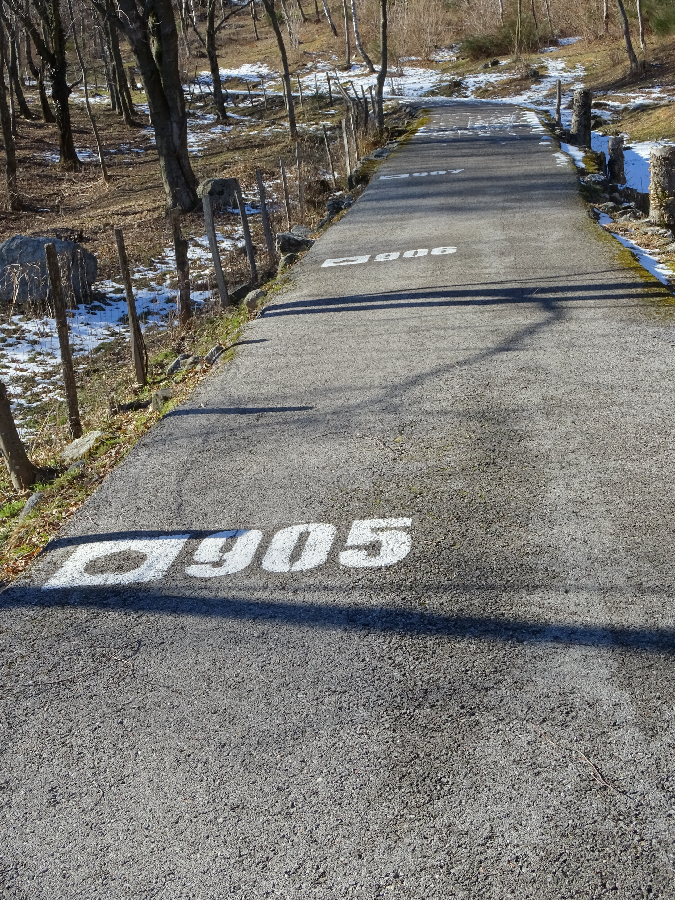 Metres above sea level marked out on the road for cyclists making the climb up the Muro di Sormano
